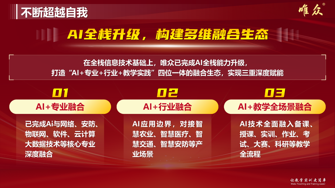 围绕这一核心理念,冉柏权总经理详细介绍了唯众的AI 全栈教学产品矩阵。作为深耕职教领域多年的实力派企业,唯众聚焦 AI、大数据、软件开发等核心赛道,打造了覆盖“理论教学 – 实训实操 – 技能认证 – 就业衔接”的全流程教学解决方案。唯众 AI 全栈教学产品兼具技术前沿性、实践适配性、教学易用性三大优势:一方面紧跟行业技术趋势,涵盖机器学习、深度学习、自然语言处理、全栈开发等核心技术模块,同步企业真实项目案例;另一方面贴合职教教学规律,开发了模块化课程体系、沉浸式实训平台、智能化教学管理系统,支持 “理实一体化” 教学模式落地;同时配套专业的师资培训、教学教研支持,帮助院校快速搭建 AI 相关专业,提升教学质量。