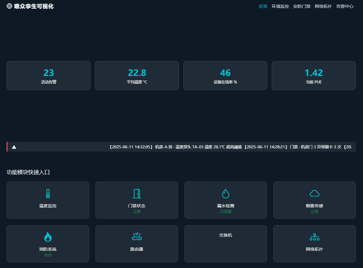 - 机房环境监控实训馆(350㎡):模拟数据中心机房场景,设置机柜区、监控室、应急演练区,配备唯众综合环境监控实训平台与各类传感器设备,开展监控系统集成与运维实训。