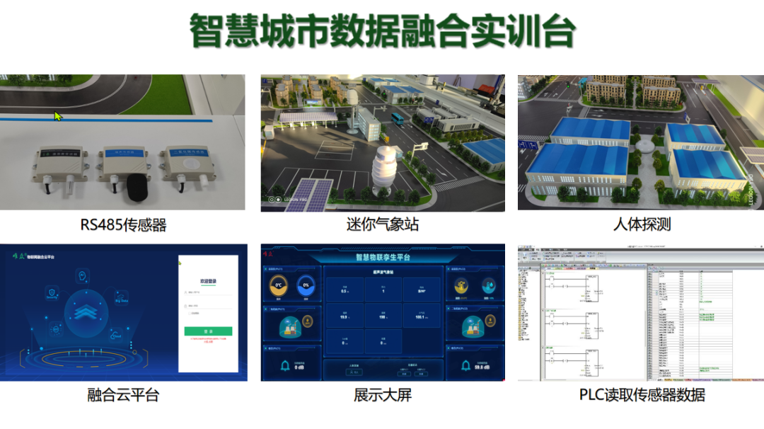 构建“终端采集 – 边缘计算 – 云端分析 – 大屏展示” 的数据处理全流程。通过 RS485 传感器、迷你气象站、人体探测设备采集多维度数据,经 PLC 读取传输至融合云平台,最终在展示大屏实现可视化呈现与智能分析。学生可训练数据采集、协议转换、数据分析与可视化的核心能力,契合智慧城市数据中台建设需求。