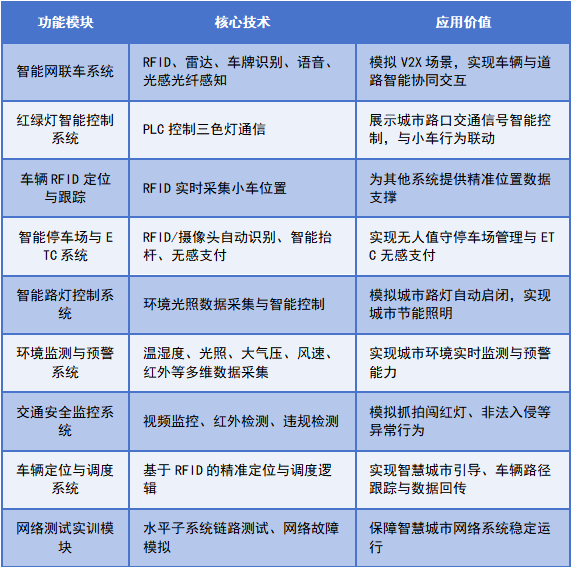平台集成九大智慧城市典型场景应用实训系统,实现高度仿真的城市交通环境。