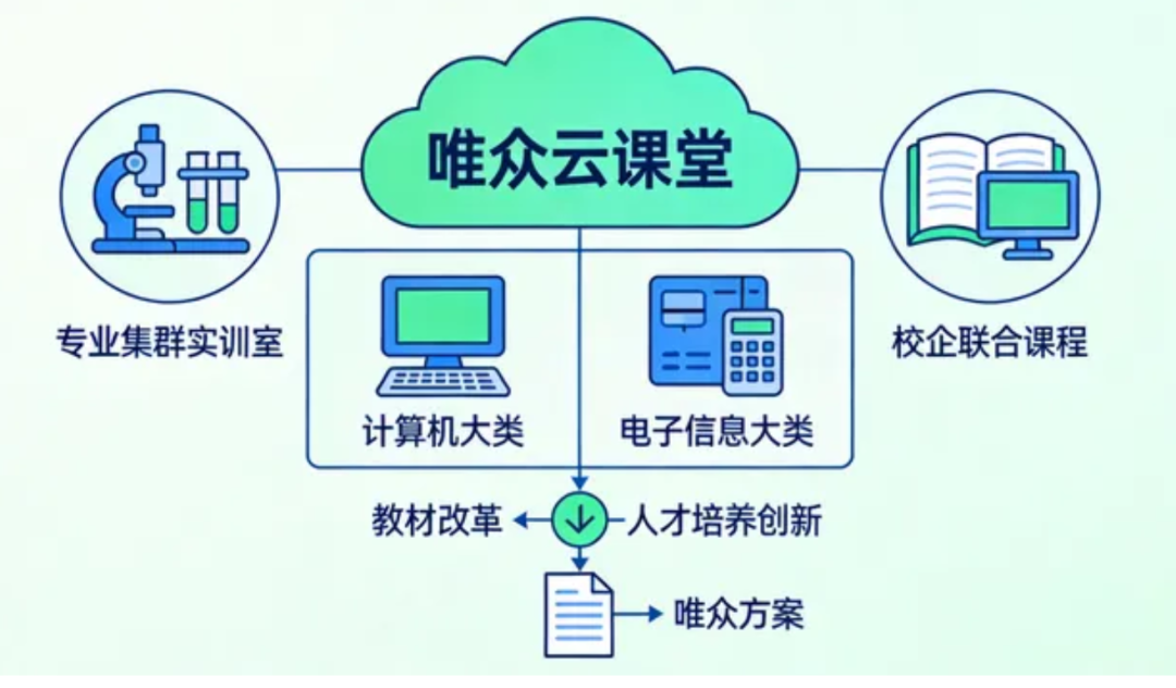 步入“十五五” 新征程,职业教育被赋予 “强化国家战略主导、深化产教融合、推进数字化转型” 的核心使命,如何破解教材与产业需求脱节的痛点,构建 “政策 – 产业 – 教育” 协同发展的新生态,成为职业教育高质量发展的关键命题。在此背景下,唯众以唯众云课堂为核心载体,凭借专业集群实训室解决方案与校企联合编纂精品在线课程的技术优势,在计算机大类与电子信息大类专业领域深耕实践,为职业教育教材改革与人才培养模式创新提供了可复制的 “唯众方案”。