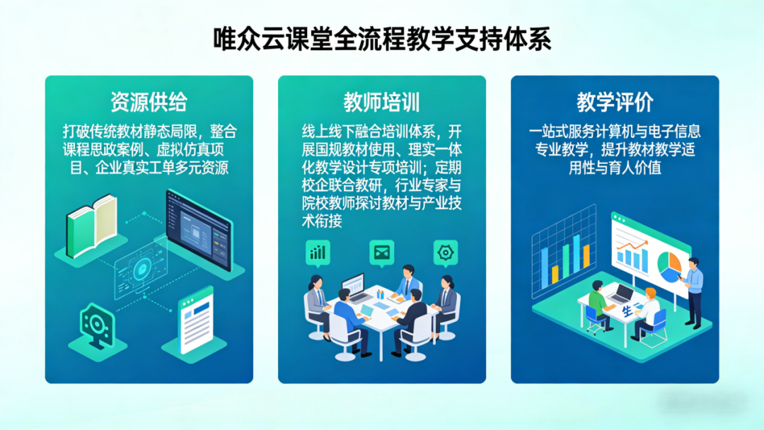 唯众云课堂构建了全流程的教学支持体系,从资源供给、教师培训到教学评价,为计算机与电子信息专业教学提供一站式服务。