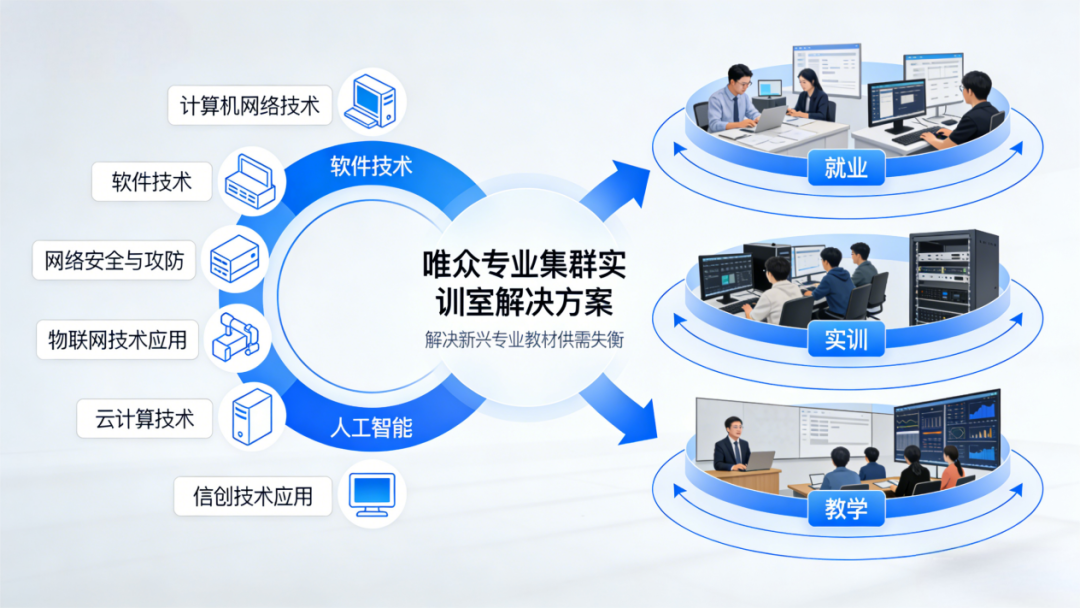 国规教材在战略性新兴产业领域的供给不足,是制约计算机与电子信息专业发展的关键瓶颈。为此,唯众构建了覆盖计算机网络技术、软件技术、网络安全与攻防、物联网技术应用、云计算技术、大数据技术、人工智能、信创技术应用等方向的专业集群实训室解决方案,为新兴专业教学提供了硬件支撑与课程载体。