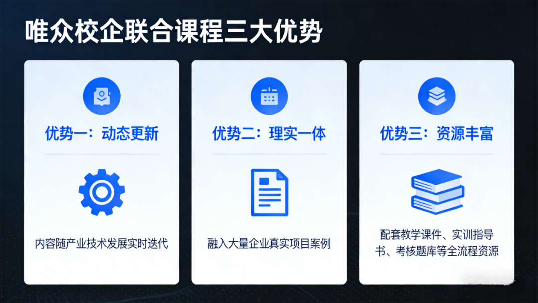 与传统教材相比,唯众校企联合课程具有三大优势:一是动态更新,课程内容随产业技术发展实时迭代,解决了教材更新周期长的问题;二是理实一体,课程中融入大量企业真实项目案例,学生可以通过项目式学习提升实战能力;三是资源丰富,课程配套了教学课件、实训指导书、考核题库等全流程资源,为教师教学提供了全方位支持。