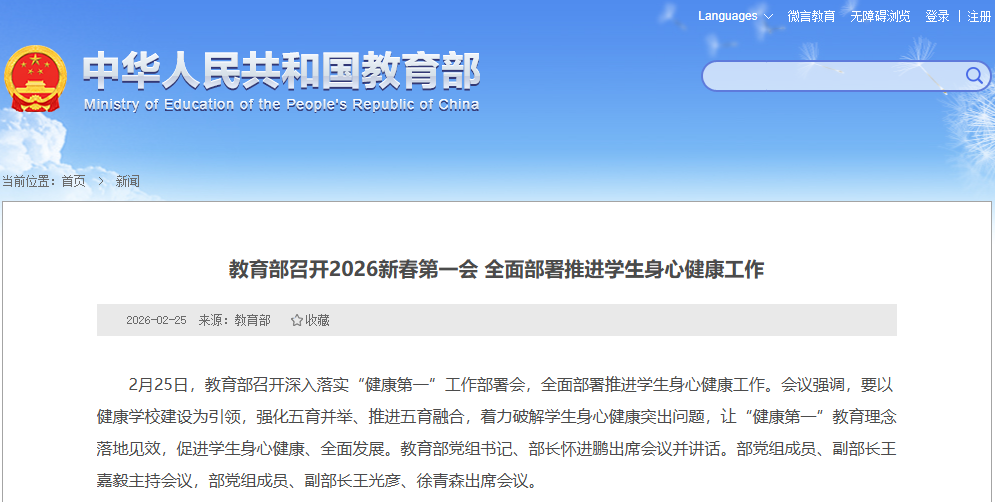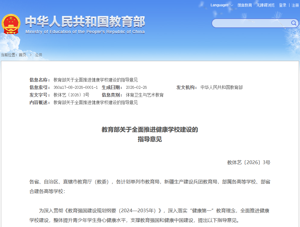 春启新程,心育护航。近日,教育领域迎来重磅政策利好——2月25日,教育部召开深入落实“健康第一”工作部署会,全面部署推进学生身心健康工作,为校园健康建设划定核心方向;次日,教育部正式印发《关于全面推进健康学校建设的指导意见》(以下简称《意见》),将心理健康教育纳入健康学校建设八大重点任务,明确提出要加快构建学校全员育心工作体系,推进全国学生心理健康监测预警系统建设,为青少年身心健康成长筑牢制度保障。另外,《意见》中还划定了2027年、2030年、2035年三个阶段的清晰建设目标,标志着青少年心理健康教育正式迈入系统化、数智化、全覆盖的全新发展阶段,也为全国校园心理健康工作提供了明确指引与坚实支撑。