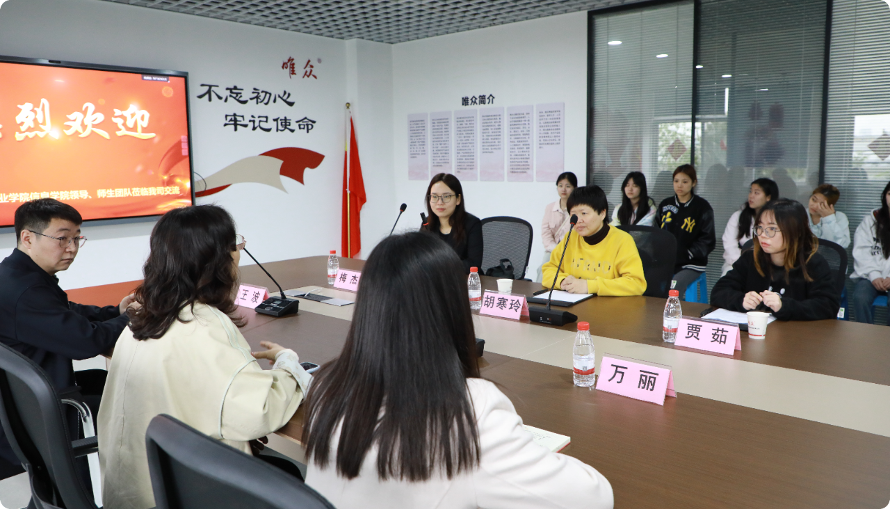 为深化产教融合,搭建校企协同育人平台,帮助学生了解行业前沿动态、拓宽职业发展视野,2026年4月23日上午,武汉软件工程职业学院信息学院党总支副书记胡寒玲、学生科科长梅杰、辅导员贾茹带领数媒2401班42名学生,莅临唯众开展“访企拓岗”专项交流活动。我司销售总经理苏丹丹、综合部主管万丽、销售经理王波全程热情接待了来访师生。