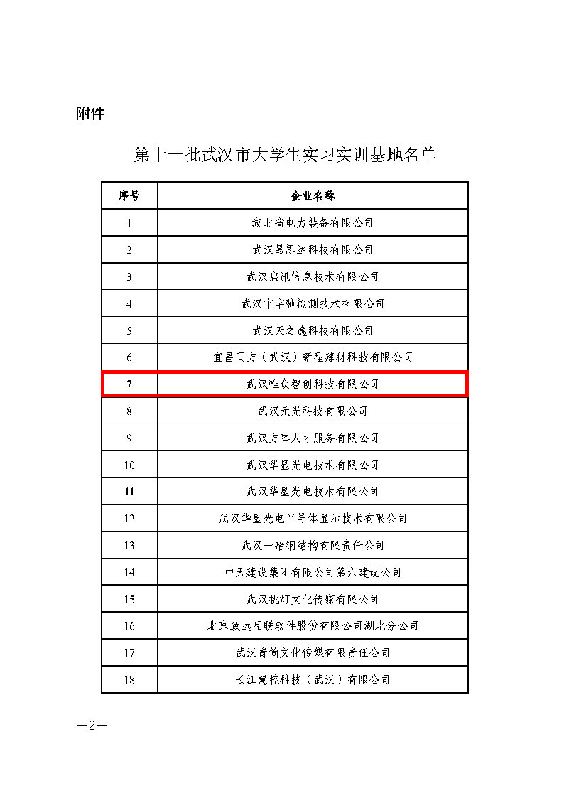 近日,武汉市人力资源和社会保障局发布了第十一批武汉市大学生实习实训基地名单,武汉唯众智创科技有限公司成功入选。