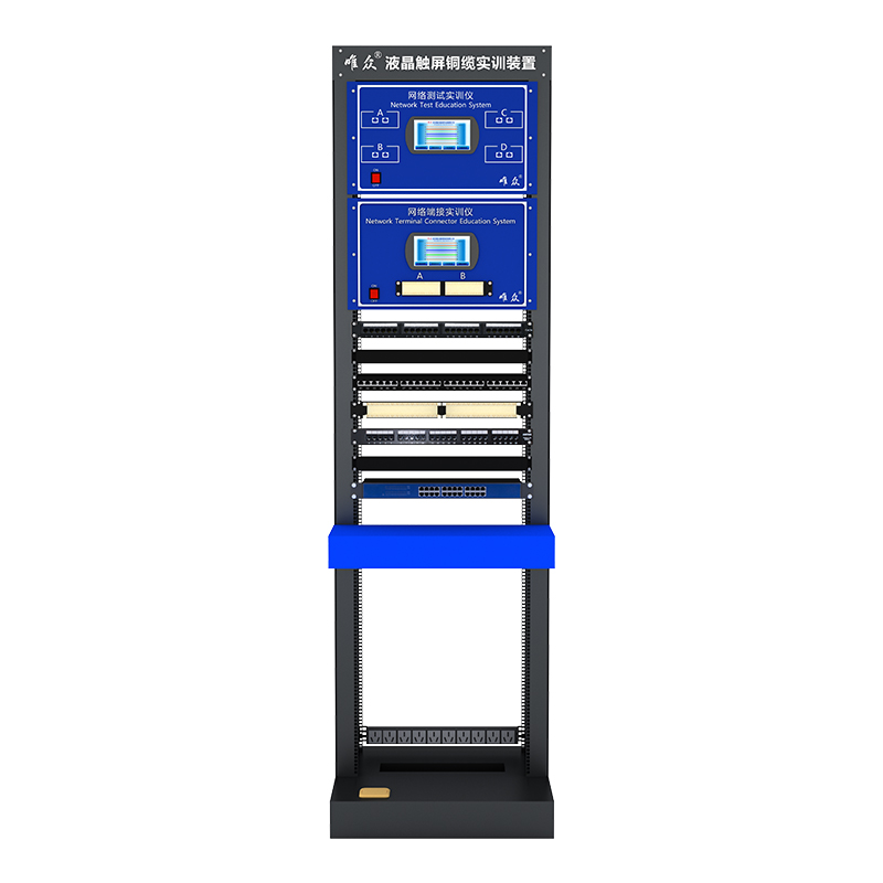 综合布线液晶触屏铜缆实训装置是综合布线实训室的核心设备,核心部件采用 7寸液晶触屏网络测试实训仪、7寸液晶触屏网络端接实训仪、4组RJ45测试、48组端接测试,液晶装置采用嵌入式操作系统;液晶触摸屏显示线缆跨接、反接、短路、开路等故障,通过网络综合布线工程布线教学实训系统V1.0可以检测铜缆通断;配套网络配线装置、语音配线装置、理线装置、数据交换装置,可进行基本链路实训及永久链路或信道实训;实训设备按照典型工作任务和关键技能实训,专门针对教学与实训着身设计,仿真典型工程任务,落地安装,立式操作,稳定实用。