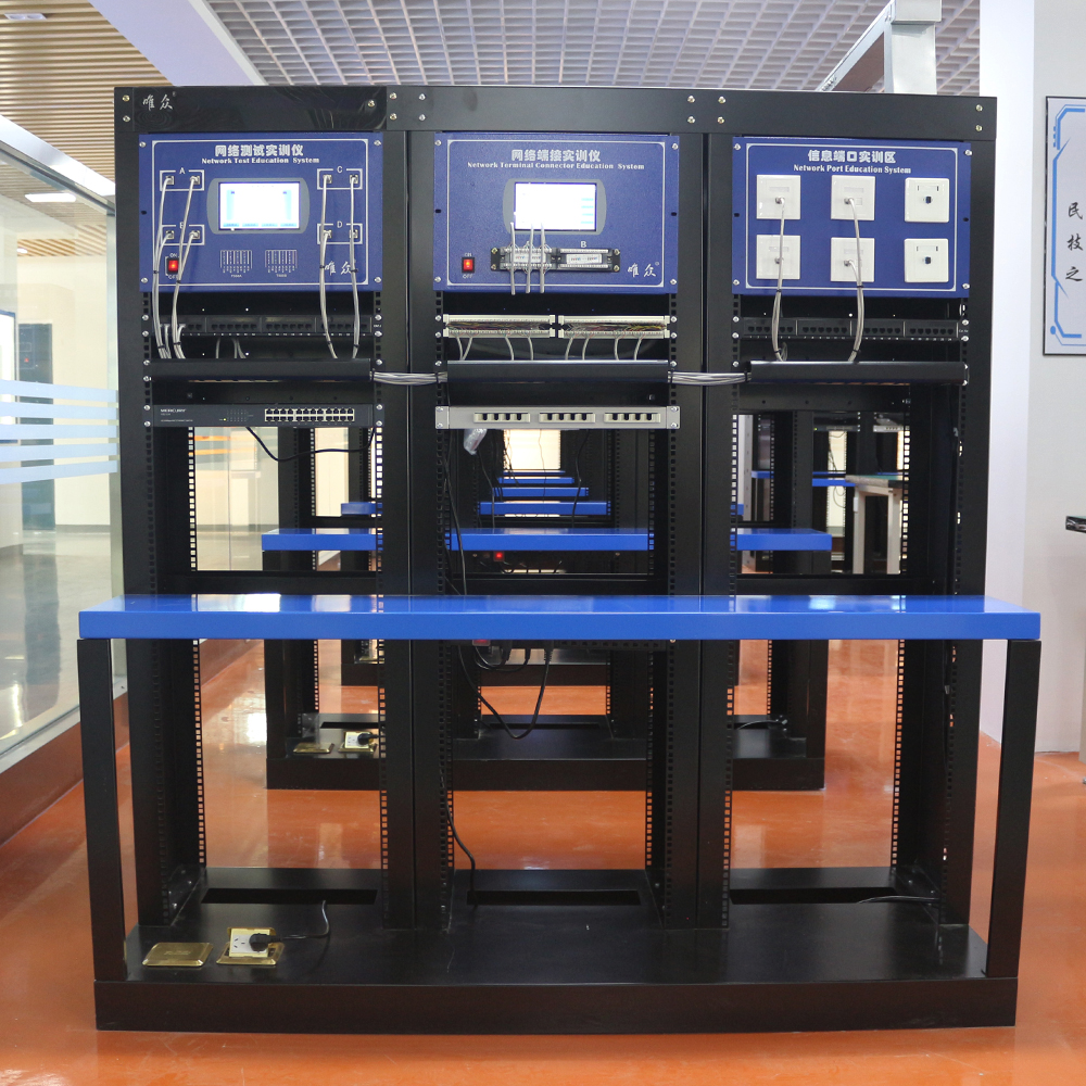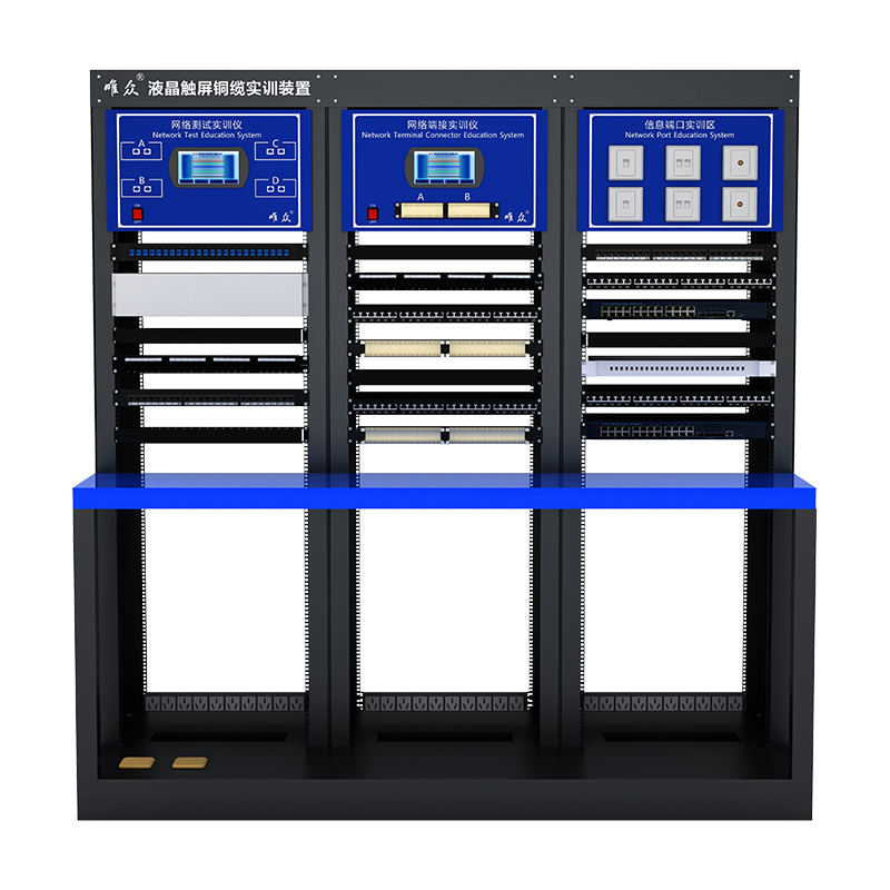 综合布线液晶触屏铜缆实训台是综合布线实训室的核心设备,核心部件采用 7寸液晶触屏网络测试实训仪、7寸液晶触屏网络端接实训仪、信息端口实训仪、4组RJ45测试、48组端接测试,液晶装置采用嵌入式操作系统;液晶触摸屏显示线缆跨接、反接、短路、开路等故障,通过网络综合布线工程布线教学实训系统V1.0可以检测铜缆通断;配套网络配线装置、语音配线装置、理线装置、数据交换装置,可进行基本链路实训及永久链路或信道实训;实训设备按照典型工作任务和关键技能实训,专门针对教学与实训着身设计,仿真典型工程任务,落地安装,立式操作,稳定实用。