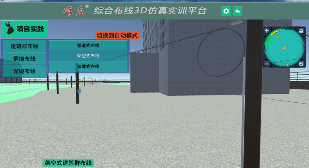 (2)仿真建筑群之间的布线和连接,包括校园门、主通道、实训大楼、教师宿舍楼和学生宿舍楼。可展示地埋式和架空式两种施工工艺的布线方式。