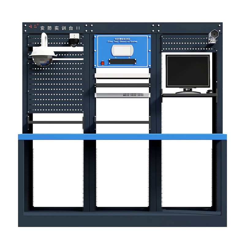 安防监控实训装置,元器件均采用实物,整个实训装置主要由控制器、塑罩壳、云台、录像机、彩电、红外摄像机、无线网络摄像机系统等组成。