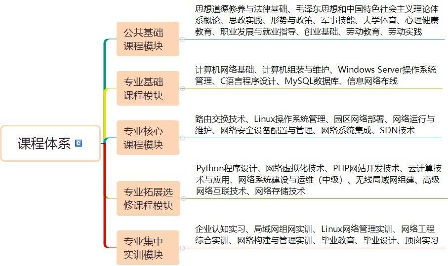 课程分为五个模块:公共基础课程模块(必修、限选、选修)、专业基础课程模块、专业核心课程模块、专业拓展选修课程模块、专业集中实训模块。