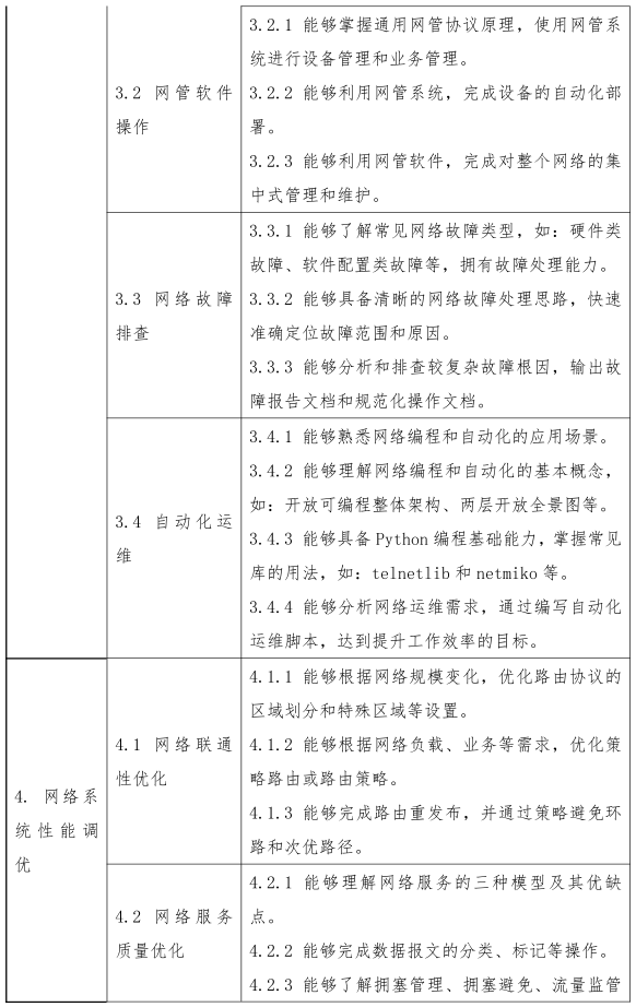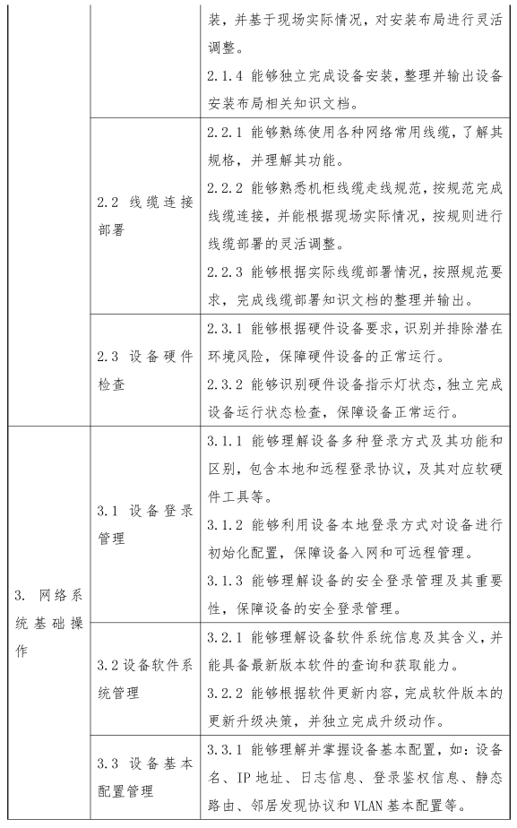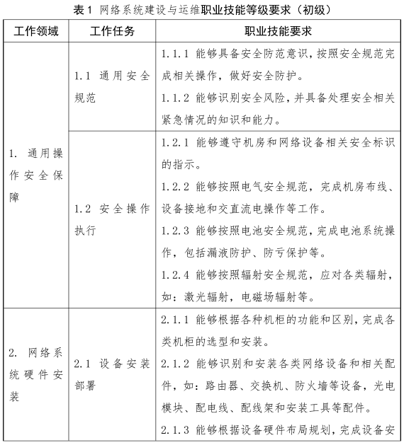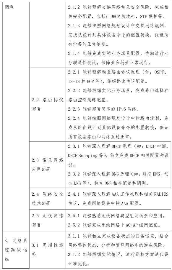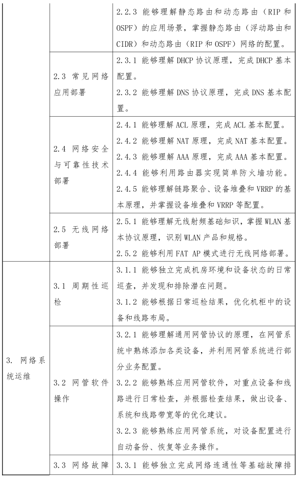 网络系统建设与运维职业技能等级分为三个等级:初级、中级、高级,三个级别依次递进,高级别涵盖低级别职业技能要求。