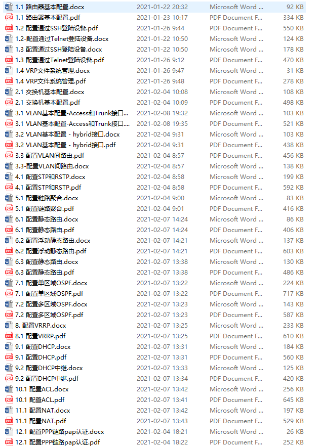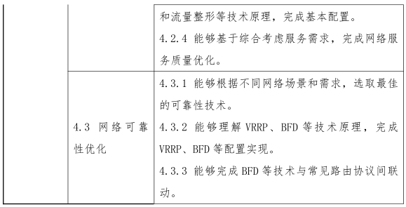 整体网络实训课程体系要求学生熟悉网络体系架构、交换路由七管理、扩展 ACL 技术原理、VRRP 技术原理、OSPF技术原理、路由重发布、广域网技术原理、无限地勘、无线网络配置、无线网络优化、出口网关维护运维、出口网关配置、审计设备运维、审计设备配置、防火墙运维和防火墙安全规则等相关技术知识。
