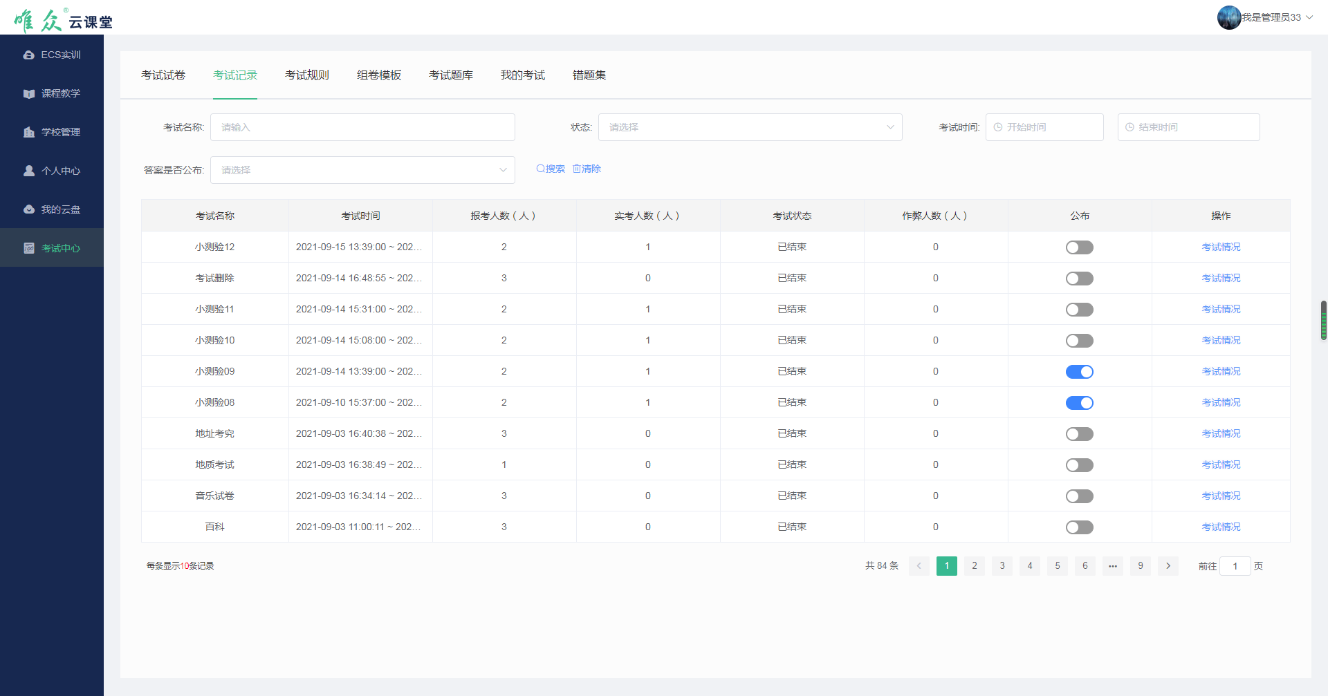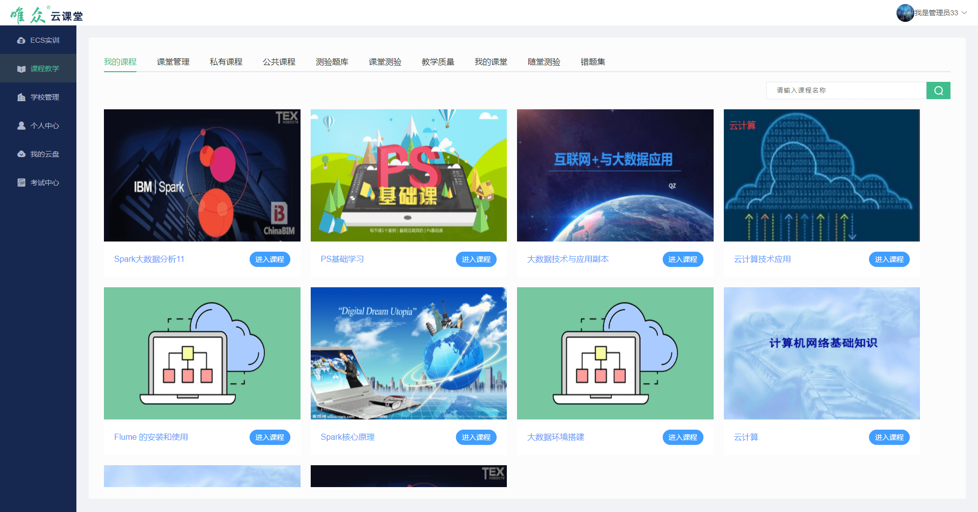 公有云平台主要承载着模拟教学全过程的私有云模块,教学云、实战云相关的业务平台。平台主要结合课程资源、教学业务逻辑组合而成,集教学、实训、测评,方便教师和学生开展教学的全过程。