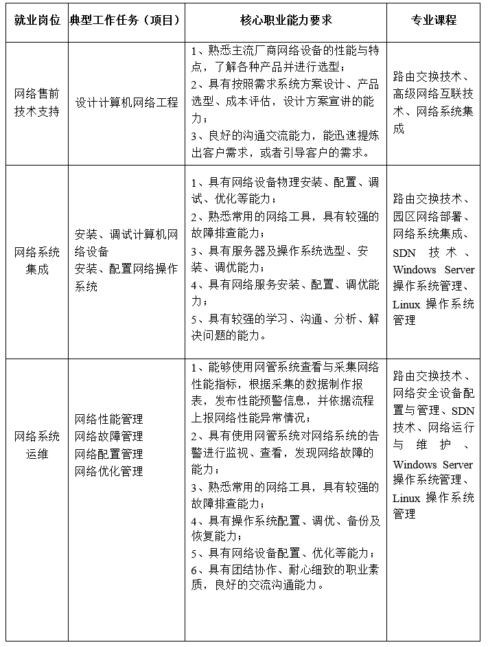 一些规模较大的网络公司都是采用具有一定工作经验或者高学历的人才进行网络的设计工作,而聘用的高职生主要是进行网络工程的实施和实施过程中的管理工作;而规模较小的网络公司则希望招聘的人才最好具有网络设计和网络实施管理双重能力。