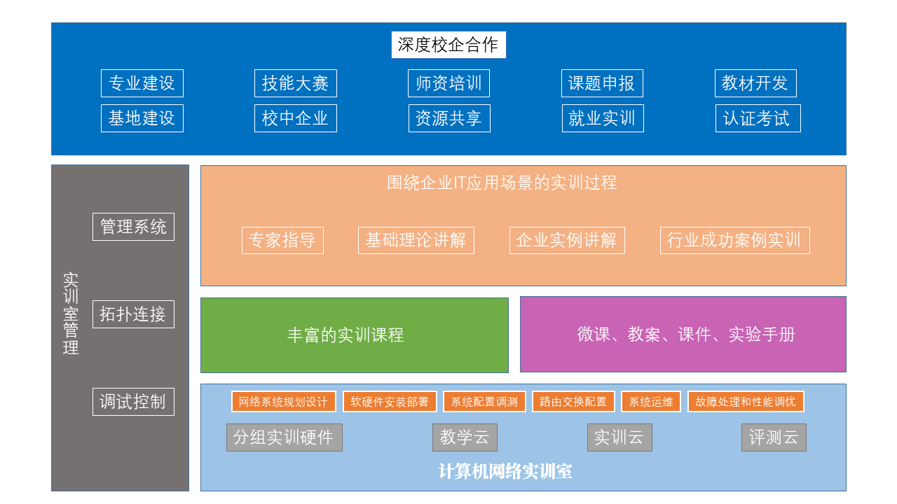 数字化转型离不开计算机网络技术。因此培养能够对计算机整体系统进行设计、综合布线、网络设备安装、调式和维护的计算机人才是当今教育教学的热点,也是社会对计算机人才的要求。计算机网络技术是一个对于实践要求很高的科目,单纯的课程理论是无法培养真正掌握网络技术、网络操作系统的人才,建设一个计算机网络综合实训室才能满足了计算机教学的实际需求。