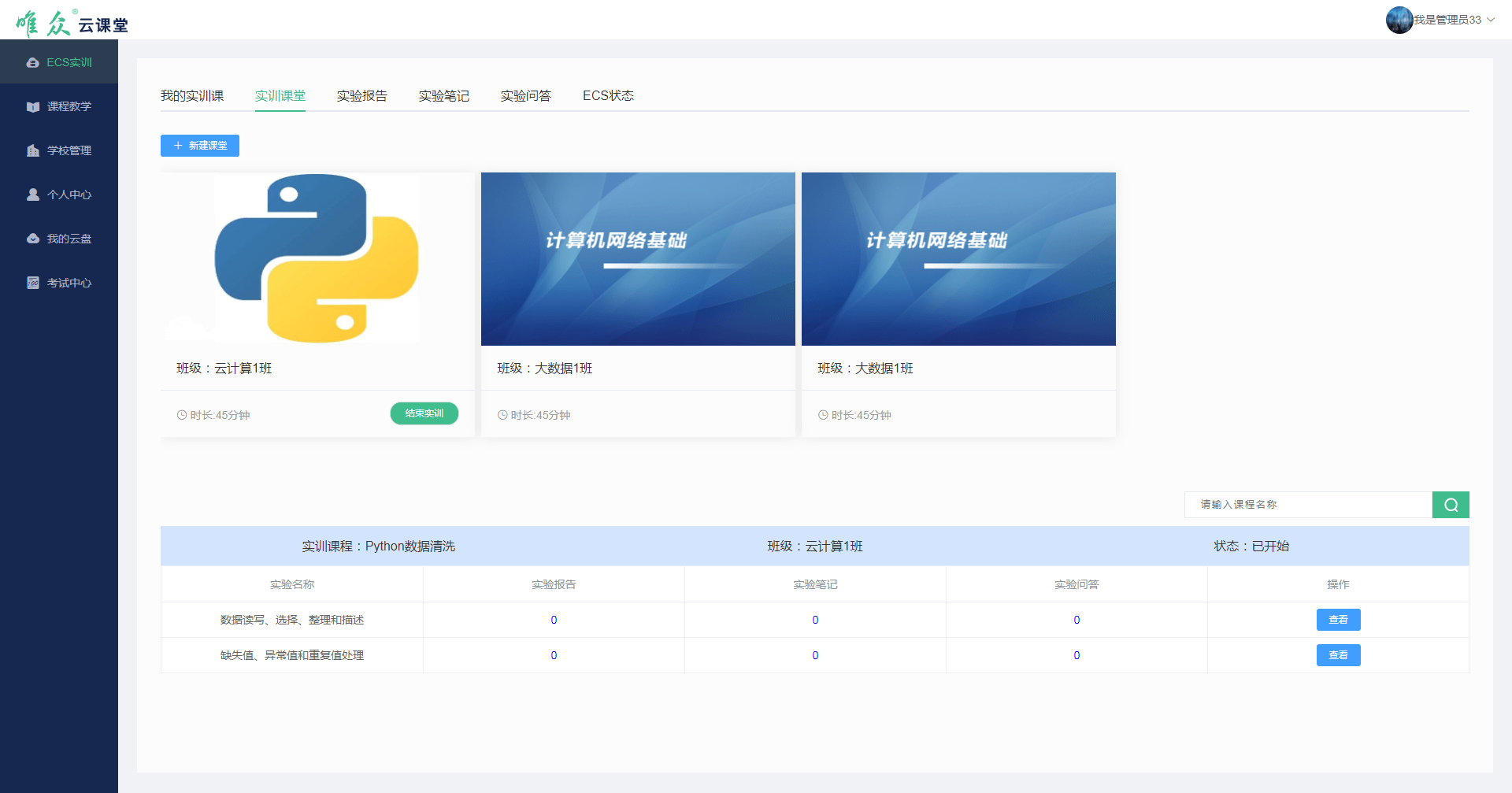 进行实验课程课堂实训(云虚拟主机),教师学生可以进行课堂实时在线问题互答,同时实验完成后提交实验报告。