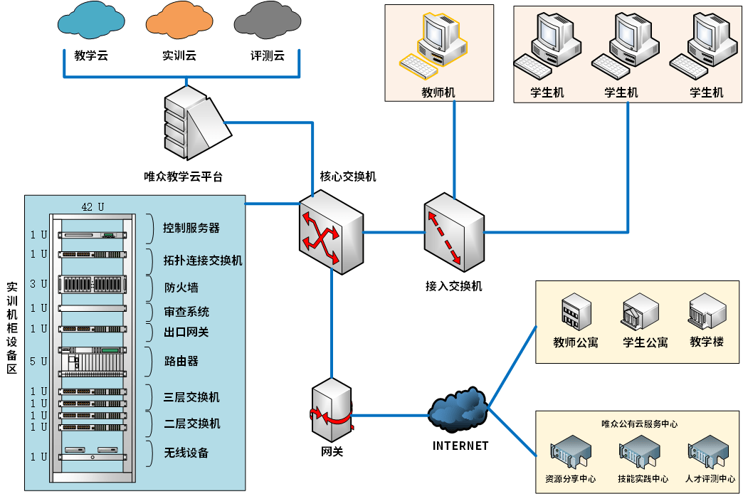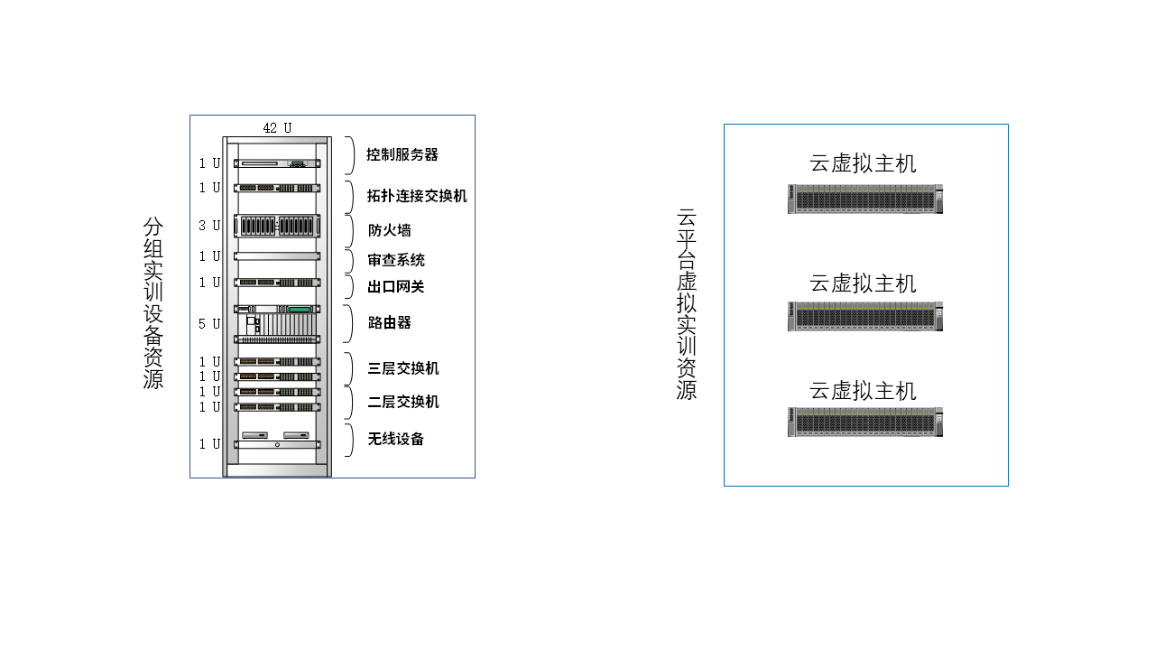 分组硬件设备由两部分组成,针对教学实训云平台服务器的管理与搭建,搭载着底层运行的服务器集群;针对专业技能学习,搭载着网络的分组硬件设备。