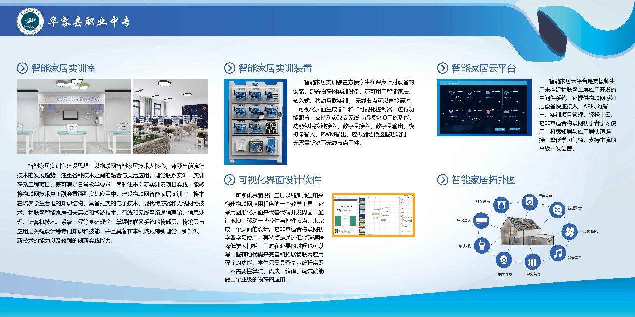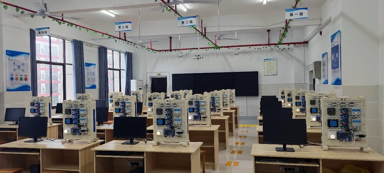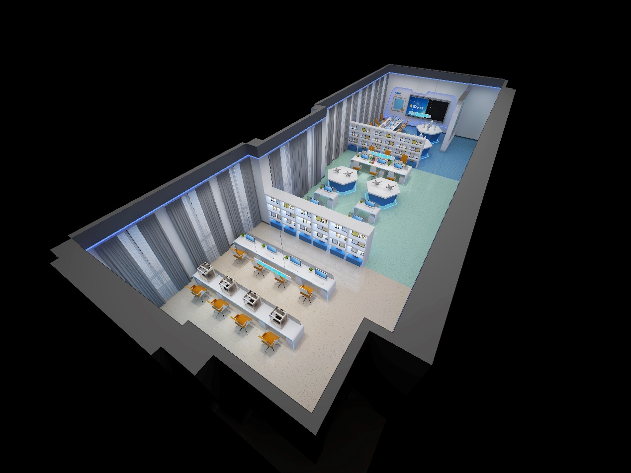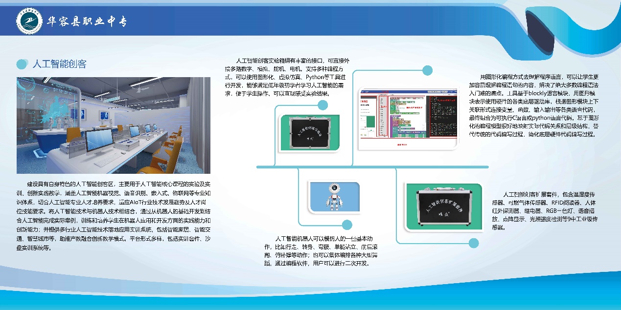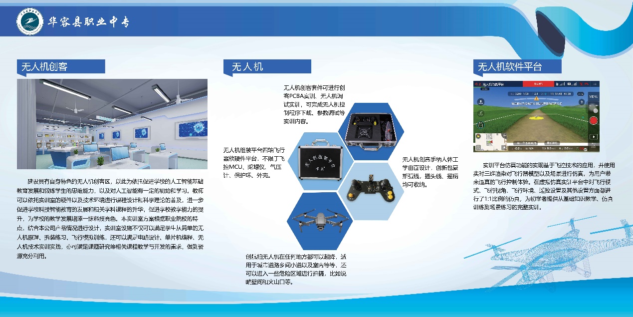 湖南华容县职业中专卓越校创客实训室由创意展示区、无人机创客区、人工智能创客区、3D打印创客区、智能家居实训室组成。