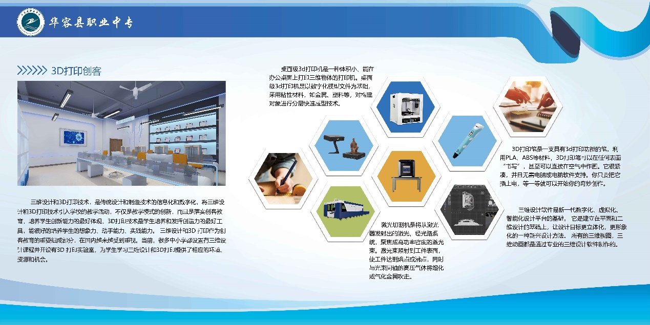 包含桌面级3D打印机(体积小)、3D打印笔、三维设计软件、激光切割机等3D打印技术设备,将三维设计和3D打印引入学校的教学活动,不仅是教学模式的创新,而且是落实创客教育,培养学生创新能力的体现。