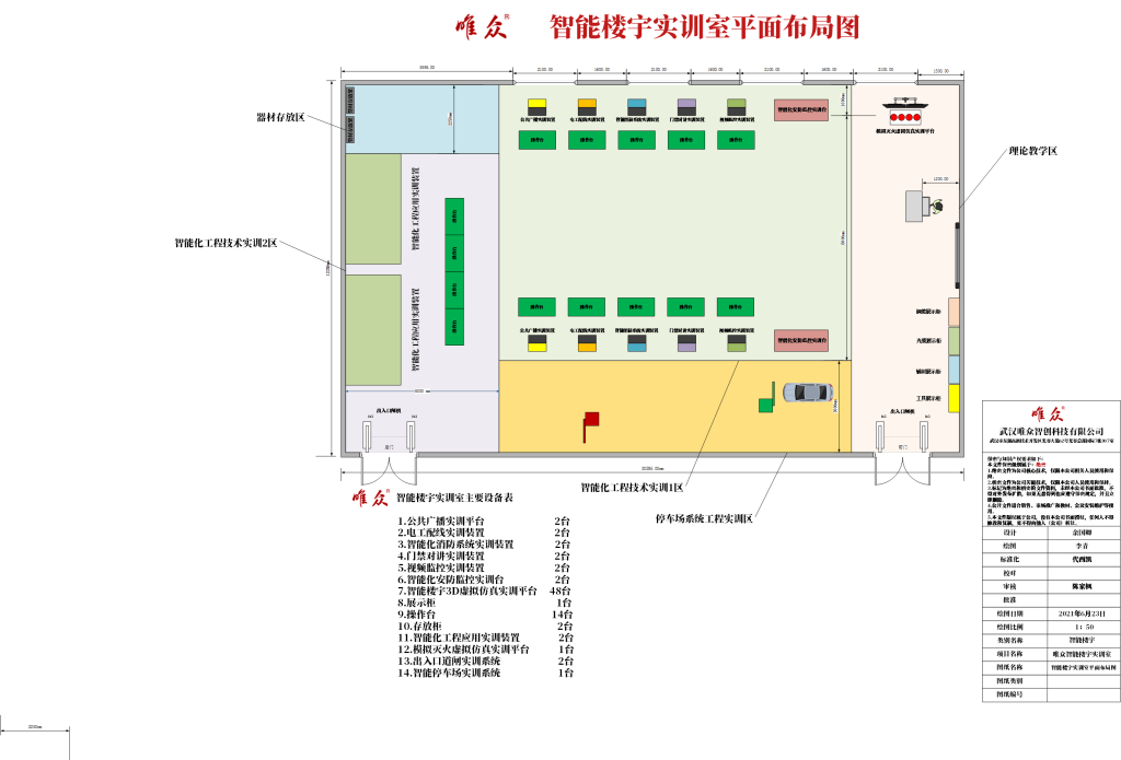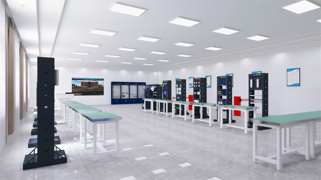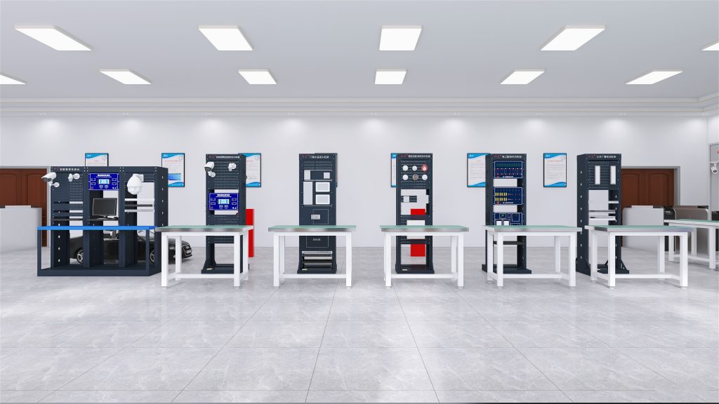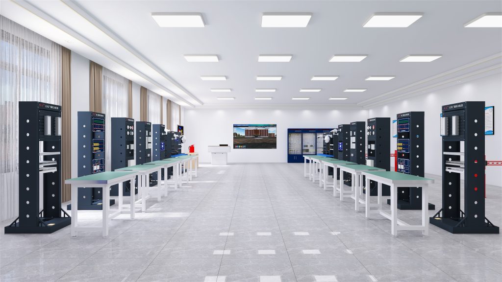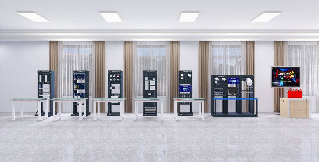 包含公共广播实训装置、电工配线端接实训装置、智能化消防系统实训装置、门禁对讲实训装置、视频监控实训装置、智能化安防监控实训台、智能楼宇3D虚拟仿真实训平台、智能化工程应用实训装置、模拟灭火虚拟仿真实训平台、出入口道闸实训系统、智能停车场实训系统、展示柜、操作台、存放柜等。