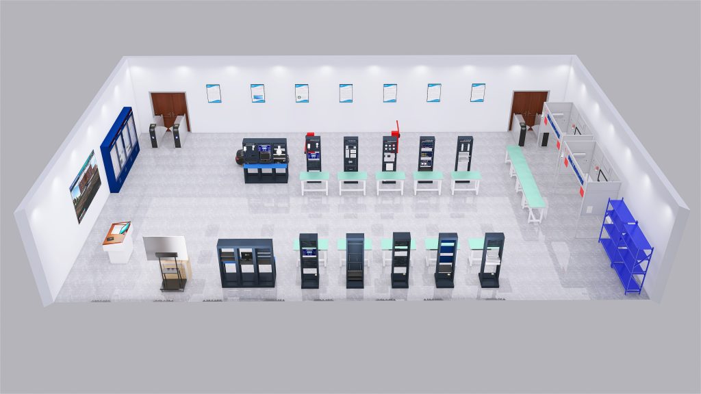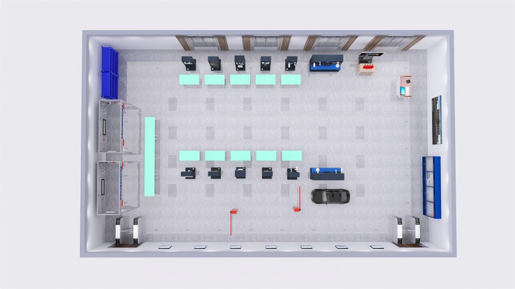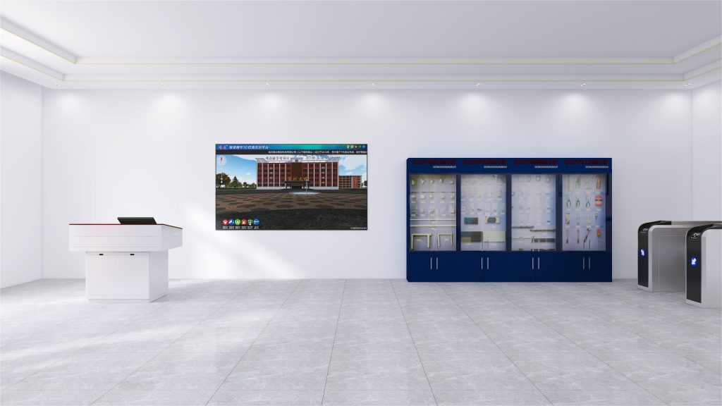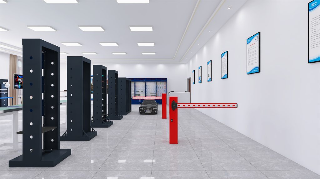 智能楼宇实训室分为理论教学区、智能化工程技术实训1区、智能化工程技术实训2区、停车场系统工程实训区、器材存放区四个部分,均为实物1:1建模。