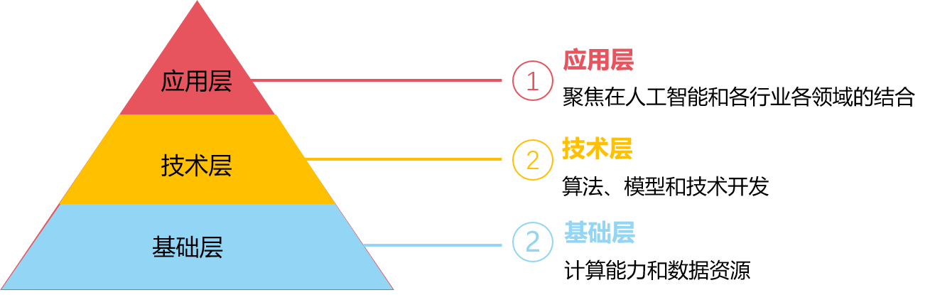 人工智能从架构上划分分为三个层次:基础层、技术层和应用层。基础层包括:人工智能的计算能力和数据资源基础;技术层包括:算法、模型和技术开发;应用层则聚焦在人工智能和各行业各领域的结合。