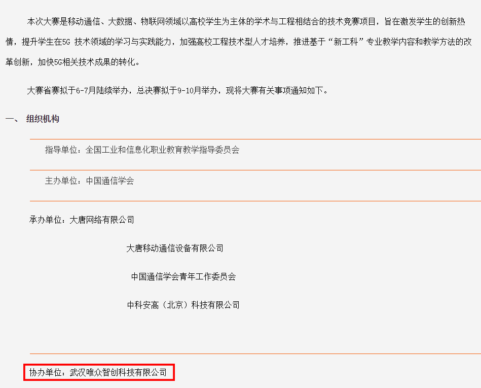 由全国工业和信息化职业教育教学指导委员会指导,中国通信学会主办,大唐网络有限公司:大唐移动通信设备有限公司、中国通信学会青年工作委员会、中科安高(北京)科技有限公司承办的,武汉唯众智创科技有限公司协办的2020年大学生5G技术及应用大赛,经充分准备,大赛省赛拟定于6-7月陆续举办,总决赛拟于9-10月举办。