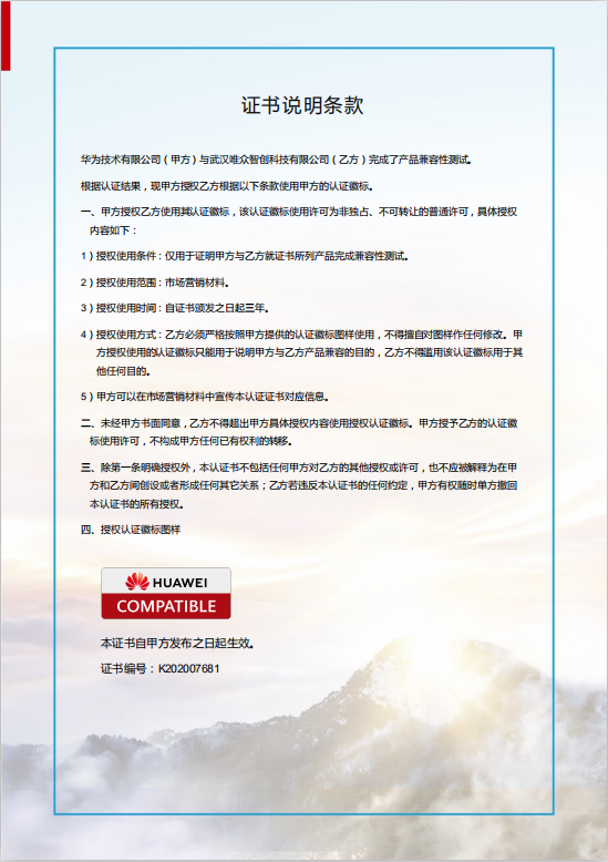 近日,武汉唯众智创科技有限公司物联网产品完成华为云鲲鹏云服务兼容性测试的认证,经过双方共同测试说明,唯众物联网产品以高度的完整性、成熟度以及强大的开放性和兼容性,性能优异,运行稳定,可以满足用户需求,与华为云鲲鹏云服务完全兼容适配。
