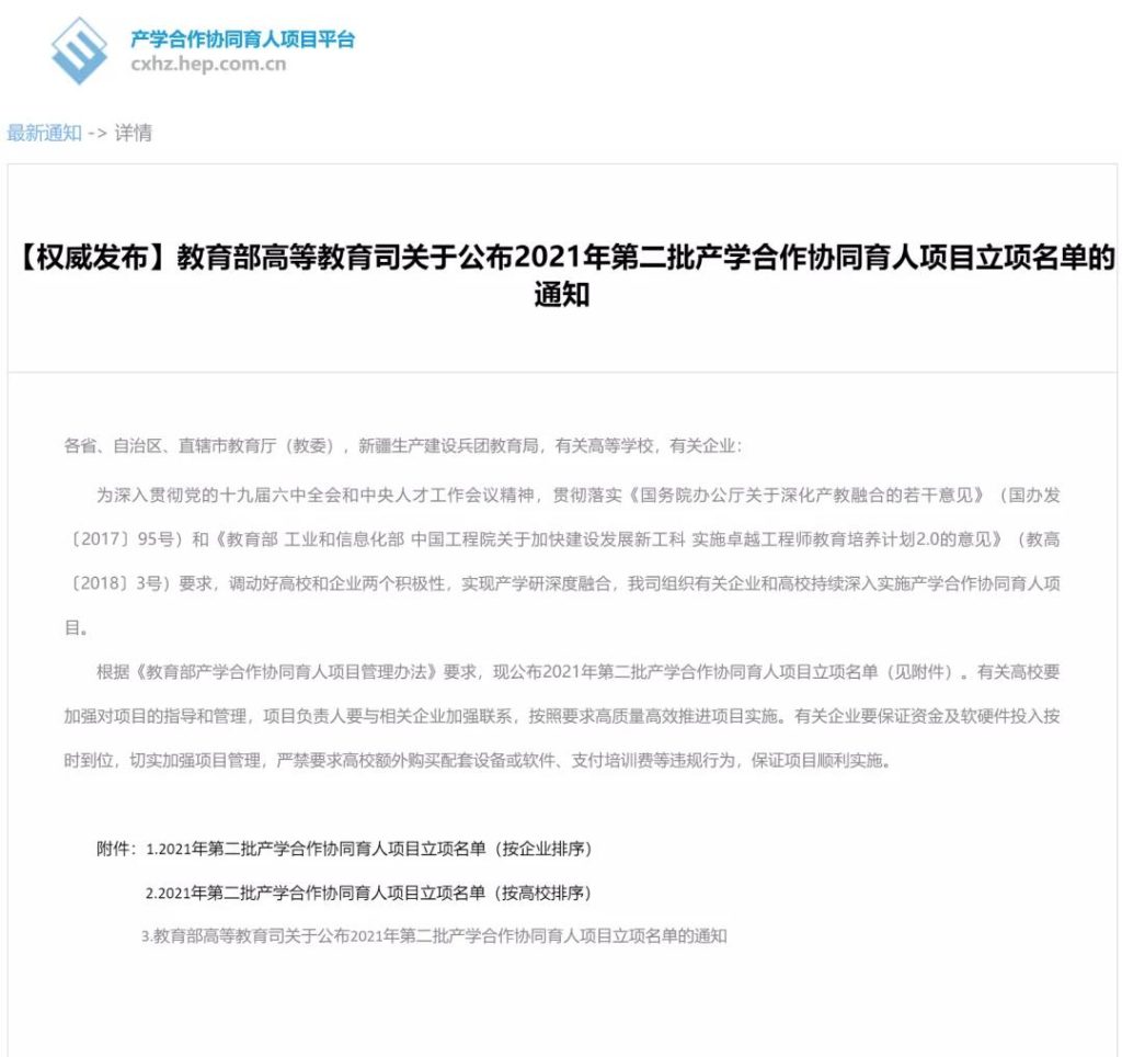 2021年12月14日,教育部高等教育司发布2021年第二批产学合作协同育人项目立项名单通知(教高司函【2021】18号),正式公布了2021年第二批产学合作协同育人项目立项名单。