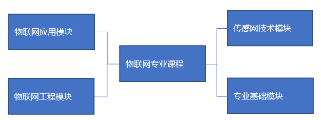 (3) 针对目前社会对于物联网行业人才的要求,云课堂以物联网应用技术所要掌握的信息采集、无线传输、信息处理等方面基本知识和技能,联网系统设计、项目管理、终端节点的安装与调试、系统集成、施工等方面实践为根据,将物联网专业课程划分为如下图所示的四个模块。