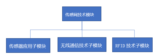 物联网专业基础模块包括物联网技术导论、电路和电子技术基础、Windows系统管理、Linux基础、编程语言(C/Java/C#)、单片机技术及应用等课程,该模块的功能是培养物联网专业的职业基础通用能力,主要在云课堂上进行理论方面的教学,或者线上的实验教学。物联网应用模块主要由物联网安全技术、数据库、物联网嵌入式开发、Android应用开发等课程构成,物联网工程模块则由综合布线技术、物联网工程实施与规划和面向智能家居行业的若干门课程构成,这两个模块主要通过物联网实训室进行线下的教学。传感网技术模块是物联网专业课程模块中的核心,传感网技术模块的构成如下图所示,由传感器应用子模块、无线通信技术子模块和RFID技术子模块构成。