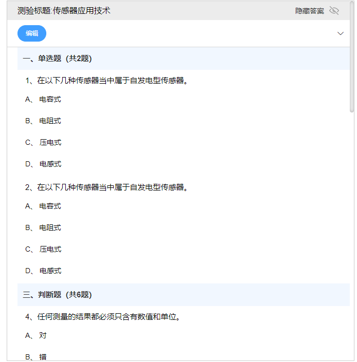 如完成“传感器技术应用”章节学习后,教师可发布”传感器技术应用“章节练习题,设置提交时间,对学生学习传感器成果进行检验,并可自行对”隐藏答案“按钮进行开关设置,选择合适的节点让学生核对自己的答案,也可在平时通过作业模块在题库选题或创建题检验学生对所学知识是否融会贯通。对于任意形式任务(作业),不限形式,不限地点(可转发至群里),学生扫码即可作答,实现多维度检验。