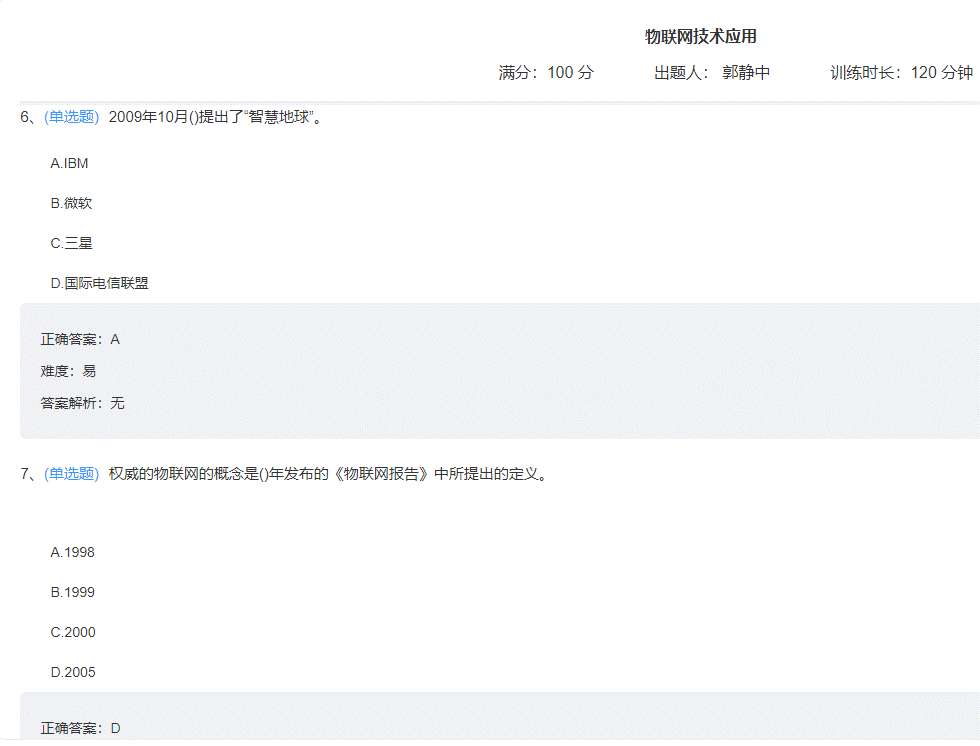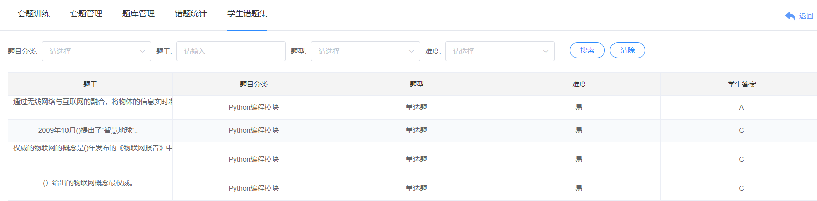 有的学生不熟悉物联网常识,有的同学不熟悉RFID等的区别,平台对考试学生错题情况进行统计,统计结果汇报教师,做到教师对学生了然于心,及时更改教学方式。