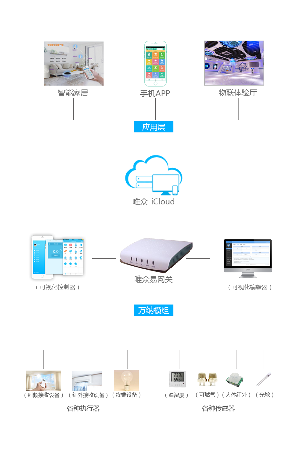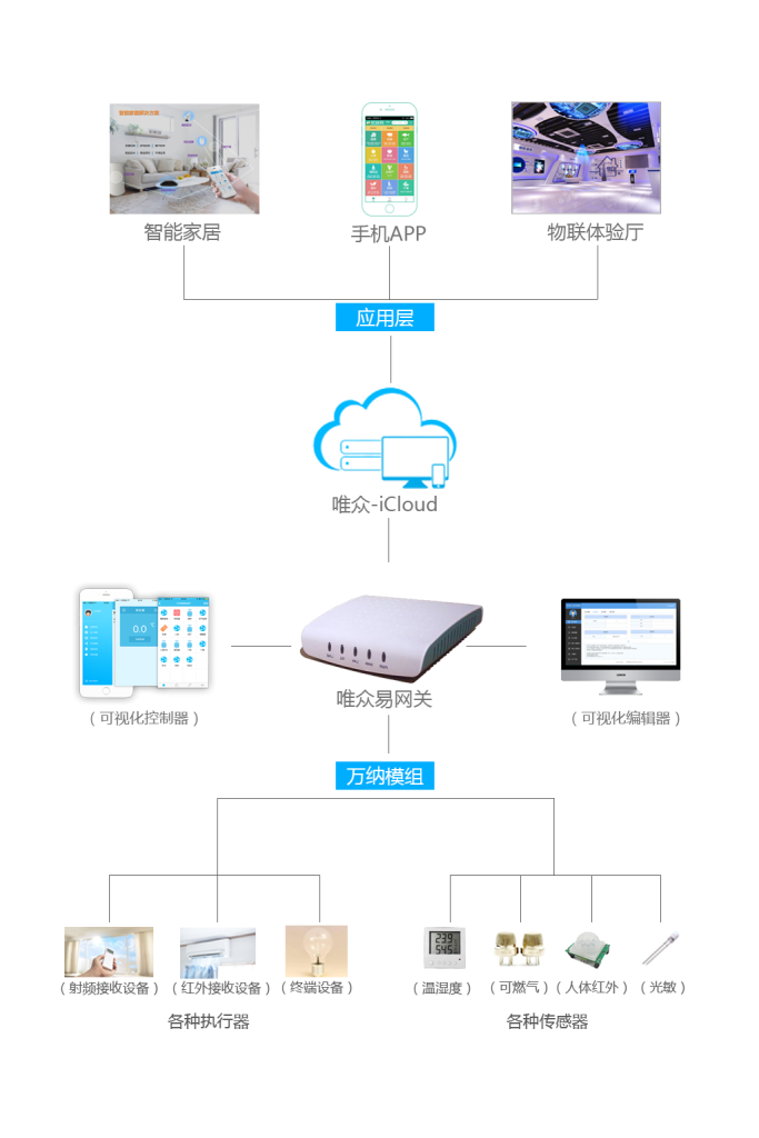 2、在实验教学方面,针对不同的专业,平台提供软件开发平台、网络仿真、大数据、数据媒体等板块共享实训课,创造实训环境,依托虚拟仿真、人机交互技术建立起来的虚拟仿真实训系统,可以逼真的模拟操作的流程,实现java、Web、大数据、物联网等多种互联网新兴技术的学习,让学生在实验的过程中加深对理论的理解,对于需要线下的硬件操作的课程,唯众还提供实训室与之结合教学,力求对学生进行全方位的培养。例如,平台结合职校学生培养综合运用能力的需要,围绕物联网基础技术及专业方向,设立多样化的实验项目,加强对学生团队精神以及创新能力的培养,鼓励学生结合所学知识与学校农业特色积极申报创新创业训练项目,强化培养学生的创新能力,科研素养和团队协调能力。具体的物联网技术应用项目如下图所示。