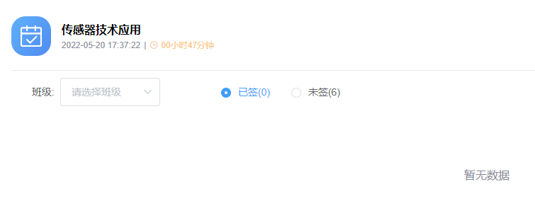教师可通过签到、主题讨论、提问、分组任务、投票、问卷、计时器等课堂活动绑定“传感器技术应用”教学课堂,配合教师讲授,发挥课堂中教师主导地位、学生主体地位,实现教学双边活动,提高教学效果。如教师发布签到活动,了解学生“传感器技术应用”课堂到课情况。