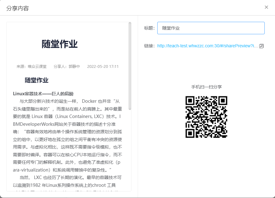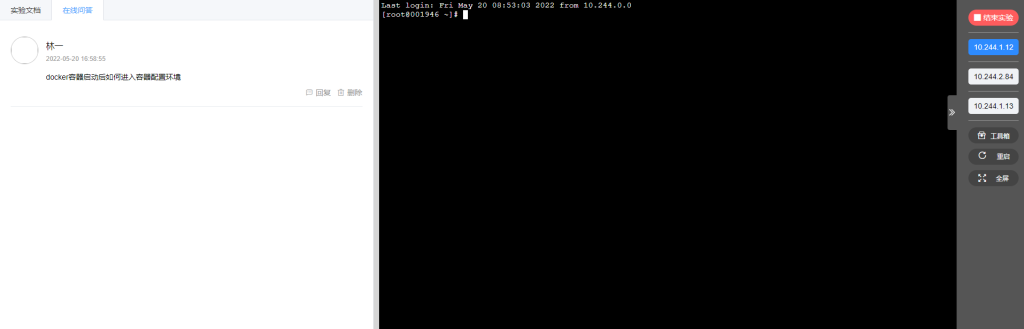 ③在线问答:Docker虽对学生来说比较简单,但仍有些基础较差的学生可能会有问题,可采用在线问答向老师寻求帮助,实现实验教学中的师生互动。