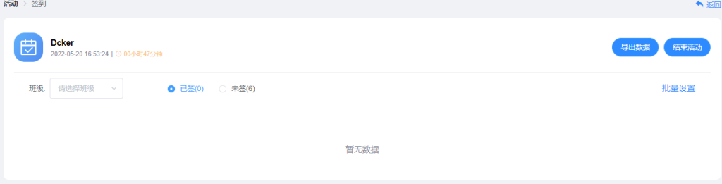 教师可通过签到、主题讨论、提问、分组任务、投票、问卷、计时器等课堂活动绑定“Docker”教学课堂,配合教师讲授,发挥课堂中教师主导地位、学生主体地位,实现教学双边活动,提高教学效果。如教师发布签到活动,了解学生“Docker”课堂到课情况。