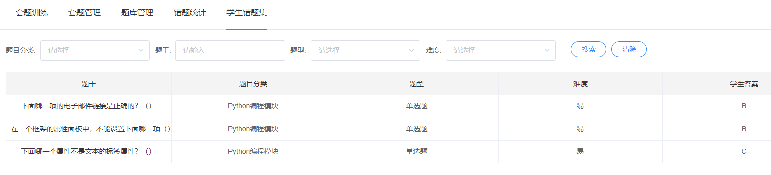 有的学生不熟悉框架属性,有的同学不熟悉电子邮件链接,平台对考试学生错题情况进行统计,统计结果汇报教师,做到教师对学生了然于心,及时更改教学方式。