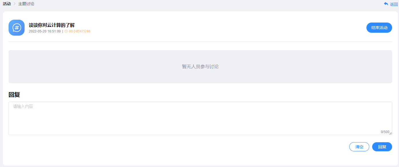 平台还提供互动模块,课前教师可发布讨论活动,询问学生对于云计算的了解,通过师生之间、学生之间交流互动,吸引学生参与兴趣,主动进入课程学习状态,让学生在大脑里建立起云计算初步印象。