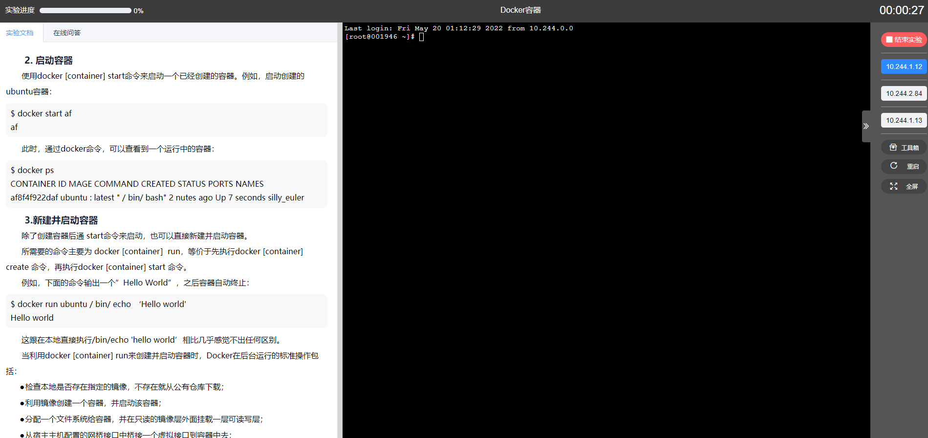 ②开始实验:师生根据教学要求,选取实验,然后点击“开始实验”就进入实验页面:实验页面采用双屏展示,左侧为实验文档区,右侧为云计算实践操作区。平台提供提供在线开发、运维环境,集成了代码编写、分析、编译、调试、运维等一整套工具能智能实现代码自动补全,学生可以在线提交实验内容,老师可以在线查看编程结果,让老师教学过程更高效,管理运维更方便,初学者更容易,入门更简单,快速进行最佳的学习状态。