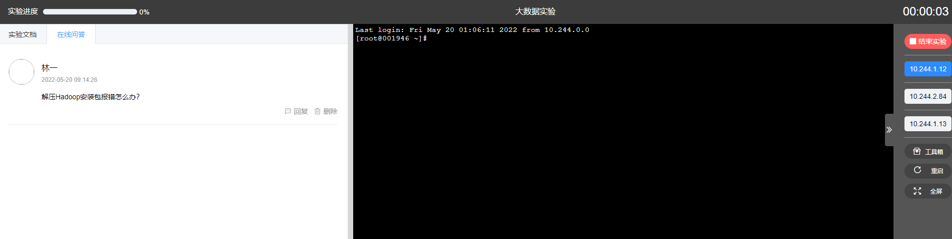 ③在线问答:Hadoop平台搭建虽对学生来说比较简单,但仍有些基础较差的学生可能会有问题,可采用在线问答向老师寻求帮助,实现实验教学中的师生互动。