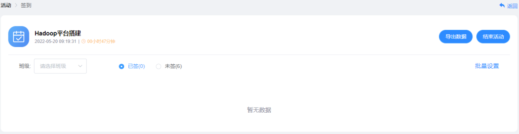 教师可通过签到、主题讨论、提问、分组任务、投票、问卷、计时器等课堂活动绑定“Hadoop平台搭建”教学课堂,配合教师讲授,发挥课堂中教师主导地位、学生主体地位,实现教学双边活动,提高教学效果。如教师发布签到活动,了解学生“Hadoop平台搭建”课堂到课情况。