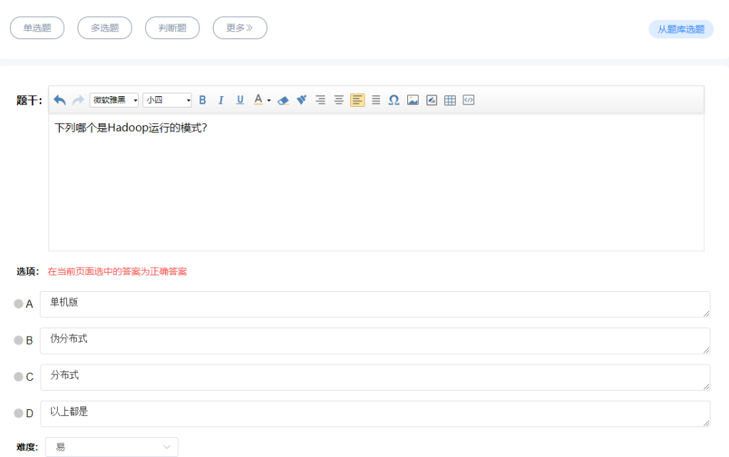 如完成“Hadoop平台搭建”章节学习后,教师可发布“Hadoop平台搭建”章节练习题,设置提交时间,对学生学习Hadoop平台搭建成果进行检验,并可自行对”隐藏答案“按钮进行开关设置,选择合适的节点让学生核对自己的答案,也可在平时通过作业模块在题库选题或创建题检验学生对所学知识是否融会贯通。对于任意形式任务(作业),不限形式,不限地点(可转发至群里),学生扫码即可作答,实现多维度检验。