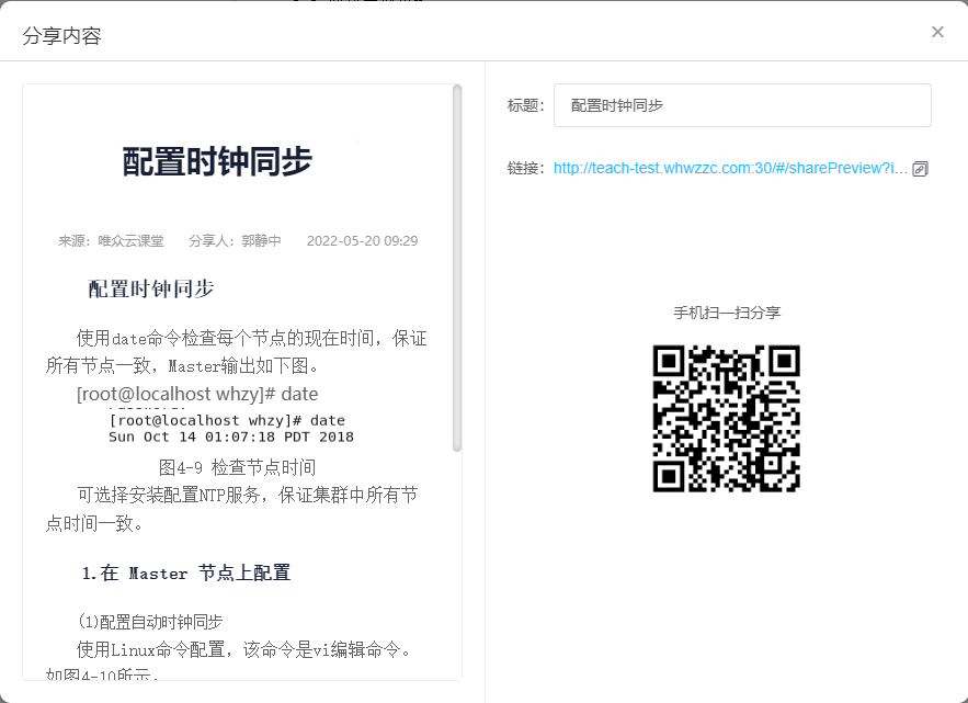 云课堂提供面对面教学与远程教学,学生预习Hadoop平台搭建章节点后,教师可随时预览当前章节内容,根据提前编辑好的内容进行理论讲授,让学生对Hadoop平台搭建理论进行学习,并可随时发布章节测试、或发布任意形式任务(当堂发布或转发至学生群,学生扫码即可回答)了解学生学习情况,或转到实验教学进行理论与实验的结合,如下图所示。
