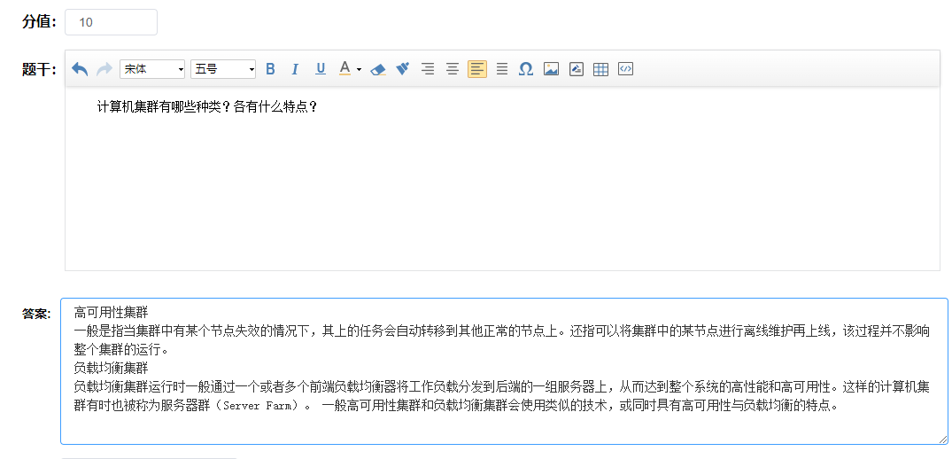 教师选择手动创建新试卷或随机从题库中抽取试题组卷,简化教师教学过程,减少不必要的时间浪费,具体的“Hadoop平台搭建“试卷主观题展示图如下所示。