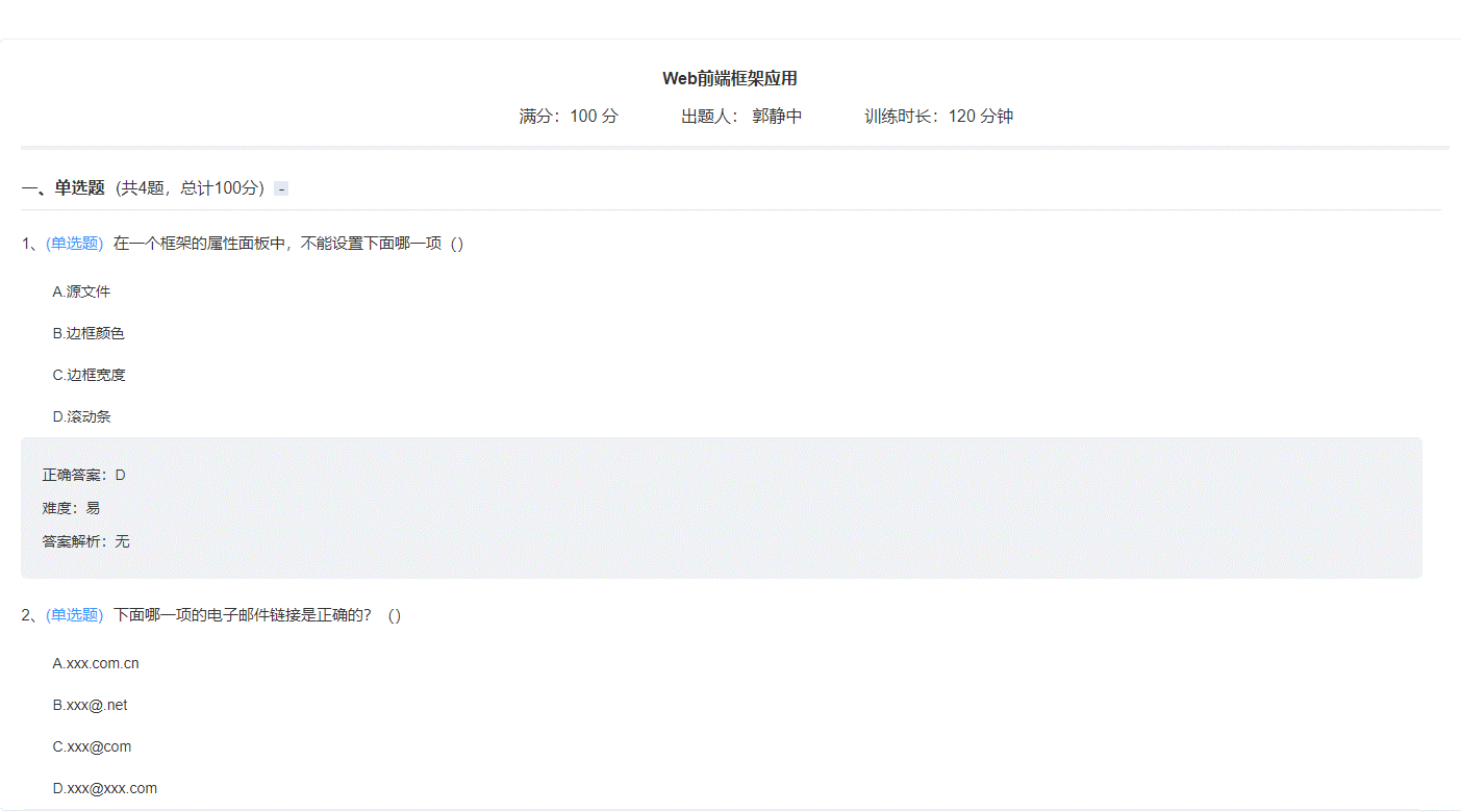 有的学生不熟悉框架属性,有的同学不熟悉电子邮件链接,平台对考试学生错题情况进行统计,统计结果汇报教师,做到教师对学生了然于心,及时更改教学方式。