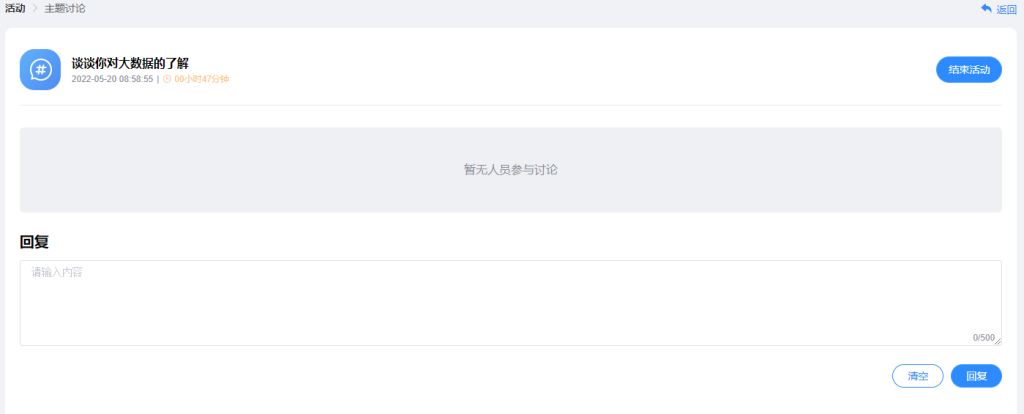 平台还提供互动模块,课前教师可发布讨论活动,询问学生对于大数据的了解,通过师生之间、学生之间交流互动,吸引学生参与兴趣,主动进入课程学习状态,让学生在大脑里建立起大数据初步印象。