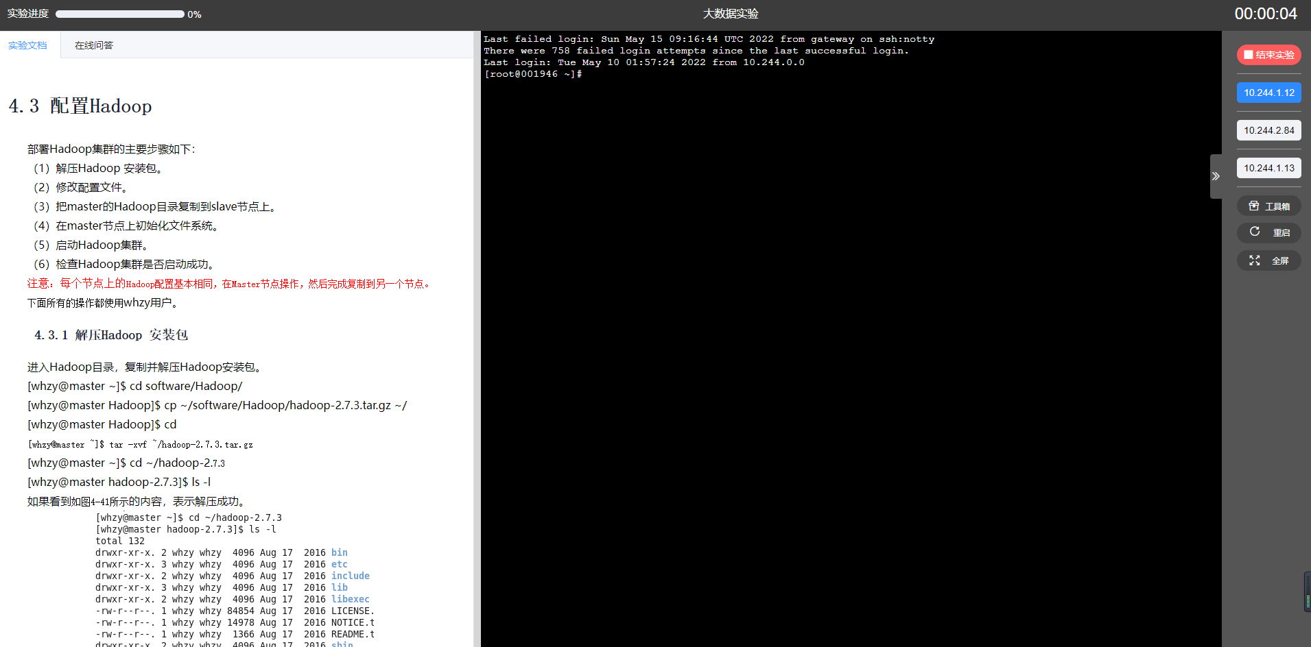 ②开始实验:师生根据教学要求,选取实验,然后点击“开始实验”就进入实验页面:实验页面采用双屏展示,左侧为实验文档区,右侧为实践操作区。平台提供提供在线环境,集成了运维、开发、调试等一整套环境,让老师教学过程更高效,管理运维更方便,初学者更容易,入门更简单,快速进行最佳的学习状态。
